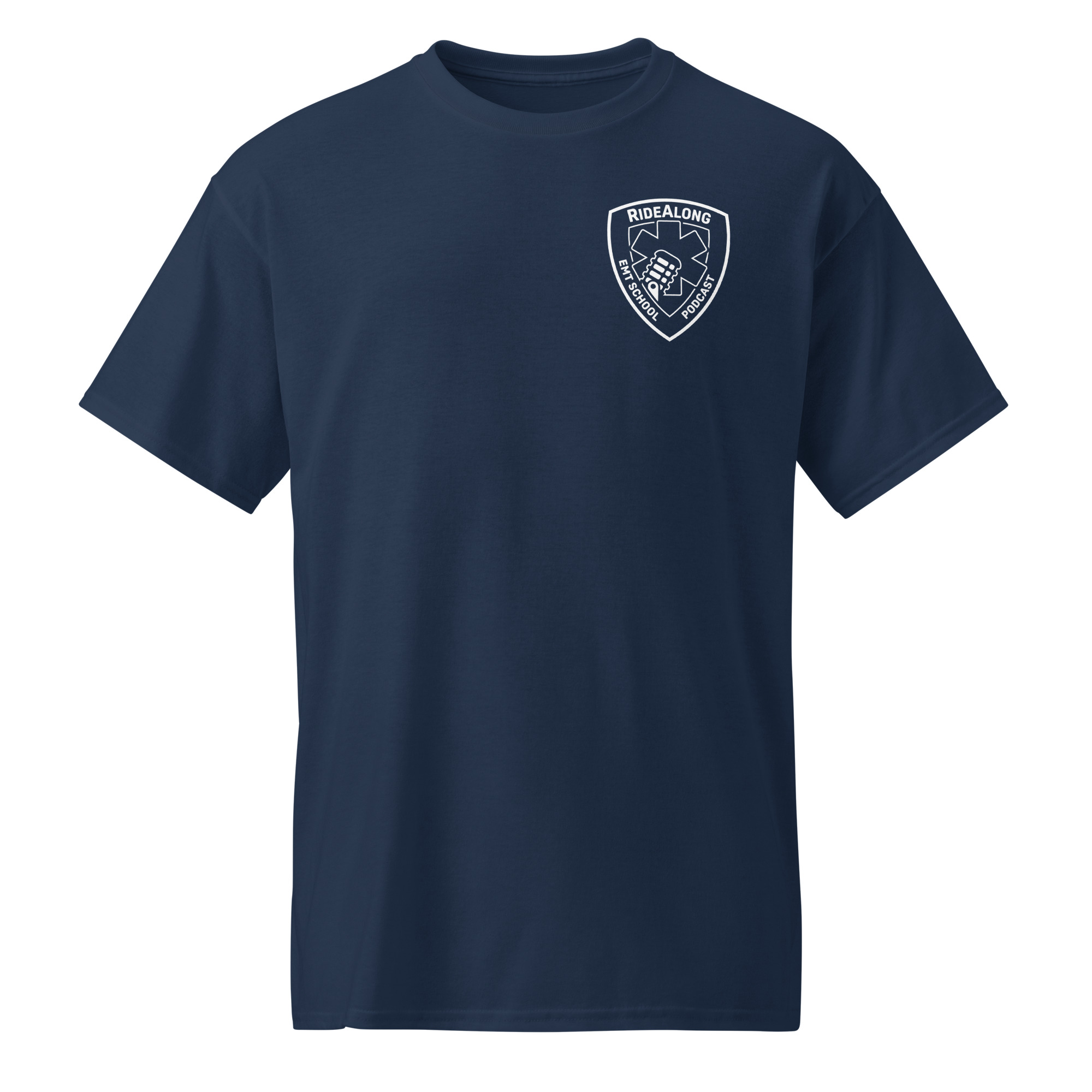 The EMT School Podcast T-Shirt from RideAlong features that classic firehouse-style look. Featuring a chest logo on the front and bold design on the back, this Gildan 8000 tee blends comfort and durability for EMT students, professionals, and podcast listeners alike.